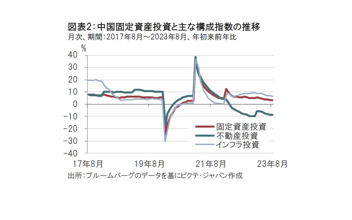 中国の8月の経済指標は、悪化が懸念されていた中国経済に底打ちの兆しがみられました。小売売上高や工業生産の改善内容の一部にポジティブな面がみられるからです。一方で、固定資産投資が伸び悩んだ背景である不動産投資は依然として減速傾向と思われます(図表2参照)。