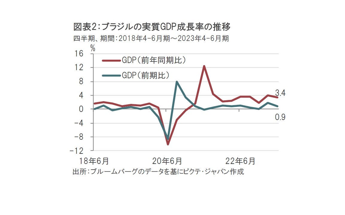 足元の話として、ブラジル景気の底堅さが挙げられます。ブラジルの4-6月期実質GDP(国内総生産)成長率は前年同期比3.4%増と、前期は下回ったものの、市場予想の2.7%増を上回りました。高水準の政策金利は景気の下押し要因ですが、一方で堅調な労働市場、財政支援、クレジット市場の改善などが成長率の押し上げ要因とみられます。需要項目を見ると個人消費が前期比0.9%増と1-3月期の0.7%増を上回りました。輸出も前期比2.9%増と堅調でした。個人消費は低所得者向けの現金給付など財政政策による底上げがあった点は割り引く必要はありそうですが、高水準の政策金利下で底堅い成長率を見せたことから、急速かつ大幅な利下げが必要ということでもなさそうです。