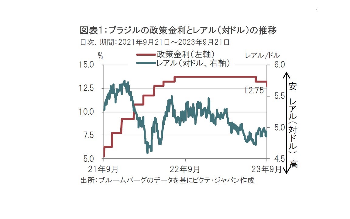 ブラジル中央銀行は2023年9月19-20日に開催した金融政策決定会合で、市場予想通り政策金利を13.25%から12.75%に引き下げることを決定しました(図表1参照)。ブラジルの消費者物価指数(IPCA)の8月分は前年同月比で約4.6%上昇と、昨年ピークを付けた時の12%台から大幅に低下しています。インフレ率の鈍化傾向が続く中、2会合連続の利下げとなりました。
