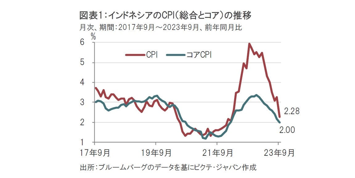 インドネシア統計局が2023年10月2日に発表した9月の消費者物価指数(CPI)上昇率は前年同月比で2.28%上昇と、市場予想の2.23%上昇におおむね一致し、前月の3.27%上昇を下回り、22年2月以来の低水準となりました(図表1参照)。