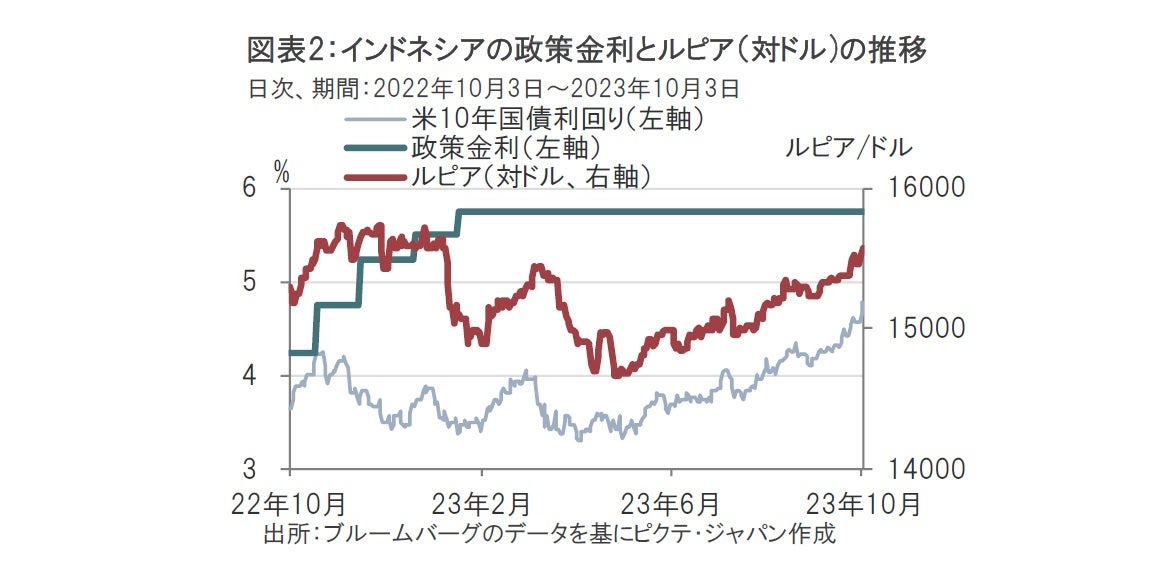 インドネシアの通貨ルピアは今年前半までは概ね上昇基調でした。インドネシア中銀は昨年8月に政策金利を3.5%から3.75%に引き上げ利上げに転じ、今年1月に5.75%にまで引き上げた以降は政策金利を据え置いています(図表2参照)。しかし23年夏ごろから米国債利回りの上昇に伴う形で、ルピア安傾向に転じています。