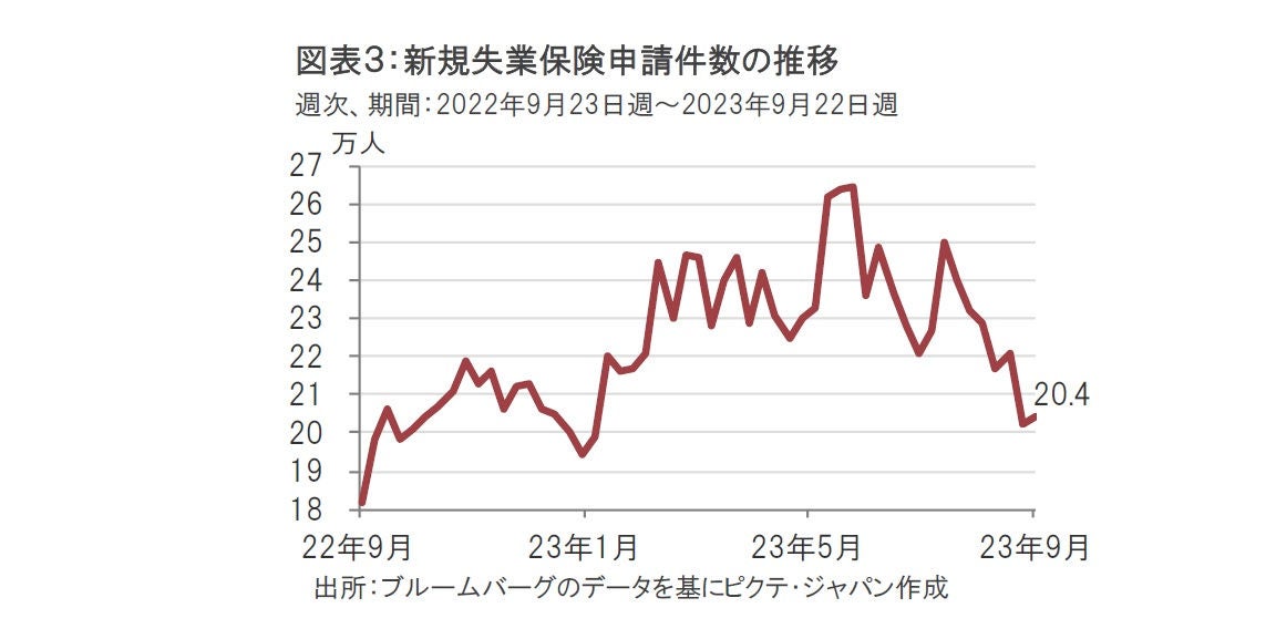 もっとも、先週発表された新規失業保険申請件数は市場予想を下回るとともに、低下傾向を維持し、労働市場がタイトであることが示されました(図表3参照)。また、2日に発表された9月の米ISM製造業景況指数、その構成指数である雇用指数が51.2と前月を大幅に上回りました。このように雇用に関連した指標が続いた後では、JOLTSでも、市場予想を大幅に上回った求人件数に目が向いてしまうのも、無理からぬことかと思います。