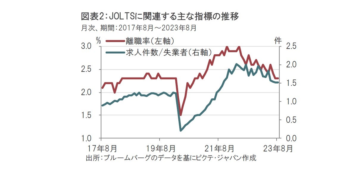 まず、8月の求人件数は市場予想を大幅に上回りました。米国はこの夏、景況感指数など一部が改善していることとも整合的です。ただし、求人件数は月ごとの変動が大きいため、来月以降の動きを見ることも必要です。また、同時に発表された離職率(自発的な就職活動の活況度の目安)は2.3%と前月から横ばいでした(図表2参照)。加えて米連邦準備制度理事会(FRB)のパウエル議長が参照しているとされる、失業者1人に対する求人件数は1.51件と前月を下回り労働市場の過熱感が緩やかながら減速が示されています。これは8月の失業者数が前月に比べ50万人以上も増加したためで、レイオフも一部あるとは思われますが、最近の労働参加率の上昇傾向から、労働市場への新規参入も想定されます。この想定が正しければ、タイトな労働市場に前向きな変化が起きていることも考えられます。