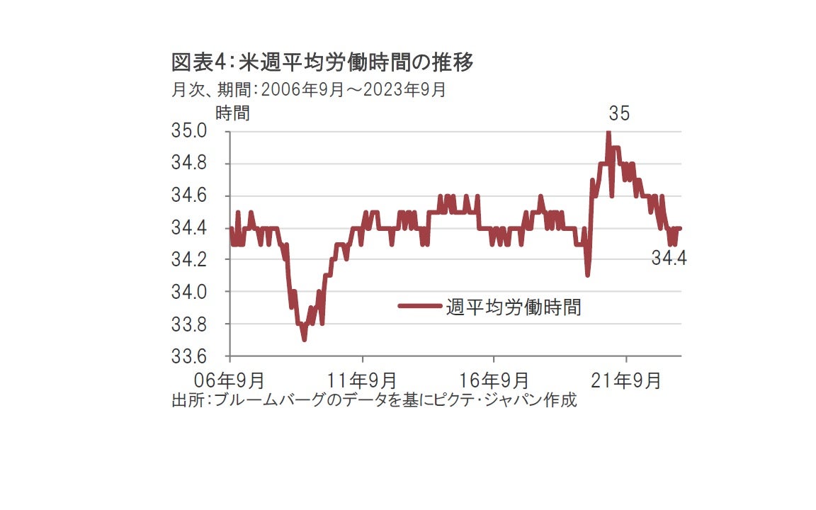 その他の指標で週平均労働時間は9月が34.4時間と、前月から横ばいで、コロナ禍の働き手不足から正常化に向かっているようです(図表4参照)。ただし、労働時間と、民間の雇用と、時間当たり賃金の積である概算の労働所得は高水準で推移しています。堅調な雇用市場が消費の下支え要因であることに変化なく、あくまで過去の労働市場の過熱感が和らいだとみるべきかもしれません。