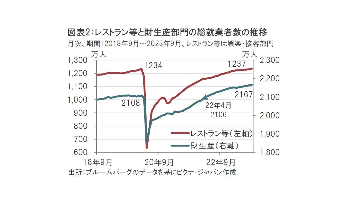 これら3部門は一般に採用の遅れが指摘されています。例えば、娯楽・接客部門で大半を占めるレストランやバーなど(レストラン等と表記)の就業者数は23年9月分が約1237万人とコロナ禍前(20年2月)の水準をようやく上回ったばかりです(図表2参照)。一方、製造業や建築業などを含む財生産部門は昨年4月にはコロナ禍前の水準にほぼ到達し、足元では労働人口の伸びなどから想定される通常の回復ペースの伸びとなっています。