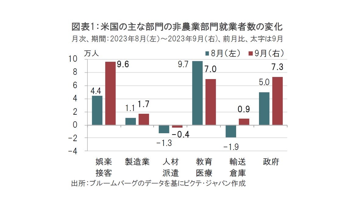 米労働省が2023年10月6日に発表した9月の米雇用統計によると、非農業部門の就業者数は前月比33.6万人増と、市場予想の17万人増を上回りました。また、8月は22.7万人増、7月は23.6万人増と速報値の18.7万人増、15.7万人増からそれぞれ上方修正されました。部門別では、娯楽・接客、教育・医療、政府部門などが雇用の伸びを力強くけん引しました(図表1参照)。