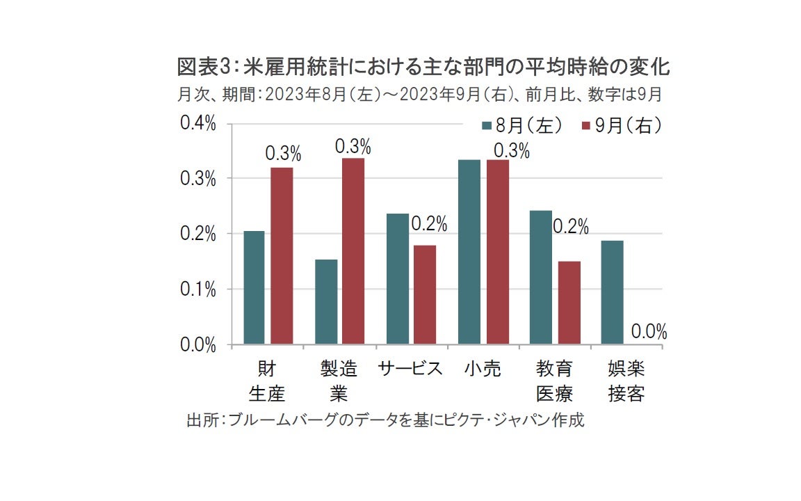 次に、賃金動向を平均時給で部門別にみると採用意欲の強さに比べ落ち着きが見られます。財生産は前月比0.3%上昇、サービス部門は0.2%の上昇にとどまっています(図表3参照)。