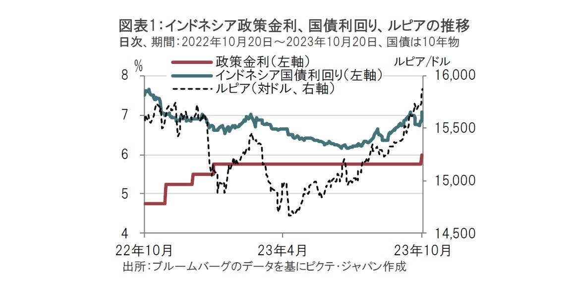 インドネシア中央銀行は2023年10月18日-19日の両日に開催した政策決定会合で、政策金利(7日物リバースレポ金利)を0.25%引き上げ、6%とすることを決定しました(図表1参照)。市場では大方が5.75%で据え置くことを見込んでいたためサプライズの利上げとなりました。インドネシア中銀は声明文で利上げの背景について、輸入インフレの影響を緩和するための予防的措置として実施したと説明しています。