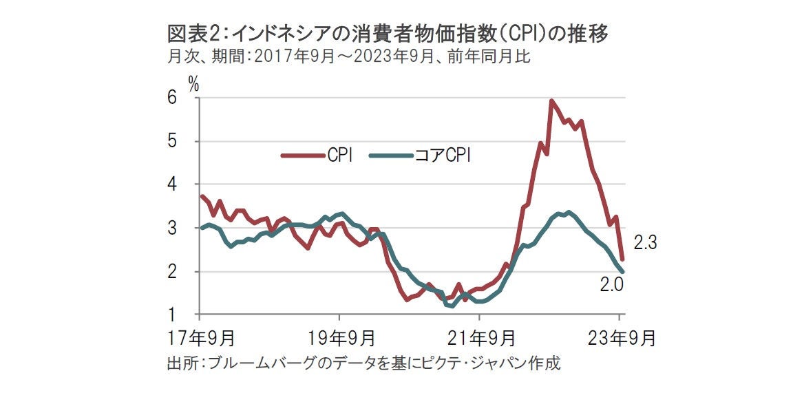 インドネシア中銀が利上げを決めた主な要因は通貨安による輸入インフレに対し先手を打った面が強そうで、足元のインフレ圧力は収まりつつあるようです。インドネシアの9月の消費者物価指数(CPI)は前年同月比2.3%上昇し、価格変動の大きい項目を除いたコアCPI は2.0%上昇となりました(図表2参照)。インドネシア中銀の23年の物価目標は3%(±1%)、24年はより抑制的となる2.5%(±1%)に設定するとしていますが、来年の目標も達成済みと、利上げを急ぐ必要は無さそうにもみえます。
