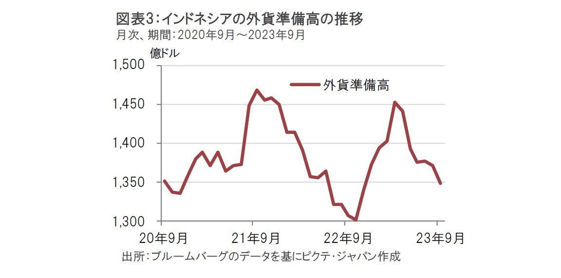 なお、ルピア安への対応として、インドネシア中銀は為替介入の実施がうかがえます。インドネシアの外貨準備高はすでに減少傾向だからです(図表3参照)。その水準は、前回の利上げ開始時期のレベルに近づいており、今回の利上げは、さらなる通貨安抑制のツールを取り出した印象です。