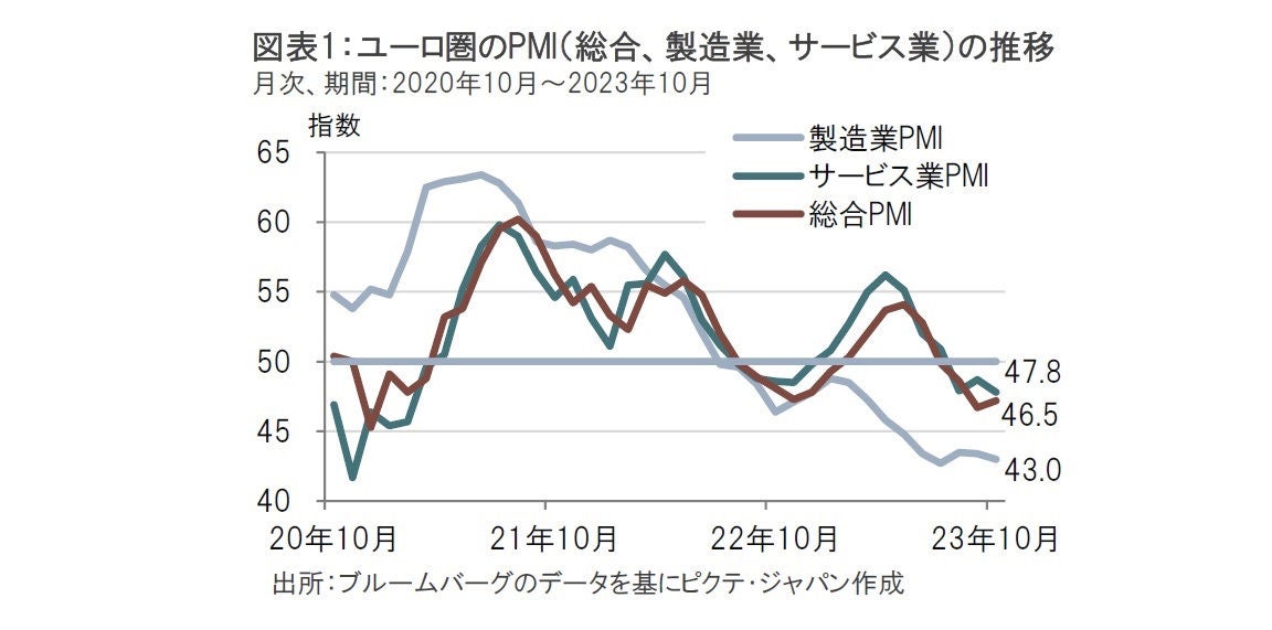 S&Pグローバルが2023年10月24日に発表した10月のユーロ圏の製造業購買担当者景気指数(PMI、速報値)は43.0と、市場予想の43.7、前月の43.4を下回りました。これにより、同指数は景気拡大・縮小の目安である50を16ヵ月連続で下回ることとなりました(図表1参照)。10月のサービス業PMIは47.8と、市場予想の48.6、前月の48.7を下回りました。10月の総合PMIは46.5となり、同指数は5ヵ月連続で50を下回りました。