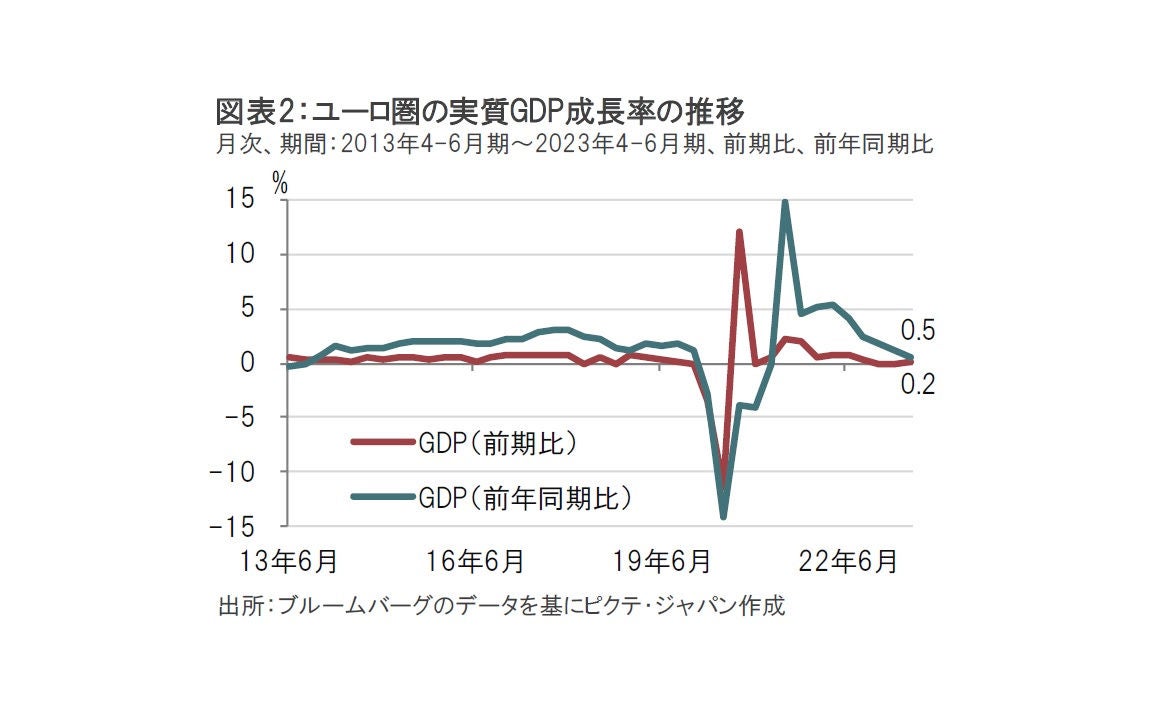 同日に発表された米国のPMIが堅調であったのとは対照的に、ユーロ圏のPMIは景気後退の可能性さえをも示唆する内容でした。PMIが示すように、ユーロ圏景気の先行きに明るい兆しが見られない中、10月31日に発表が予定されている7-9月期の実質GDP(国内総生産)成長率も気になるところです(図表2参照)。前期比は4-6月期が0.2%増とプラスを確保しましたが、その前2四半期はほぼゼロ成長でした。