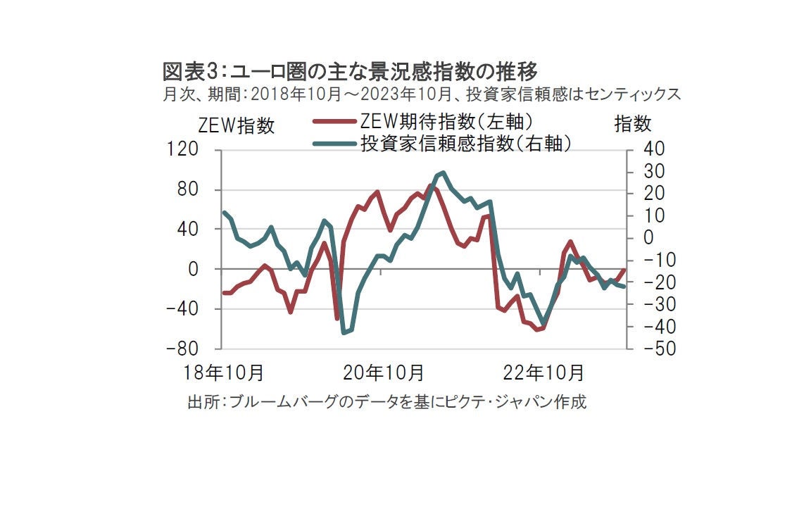 もっとも、ユーロ圏景気が底割れして深刻な景気後退に直面するとの見方は少ないようです。PMI以外の景況感指数の中には、水準は低いものの、景気悪化に底打ち感も見られます(図表3参照)。