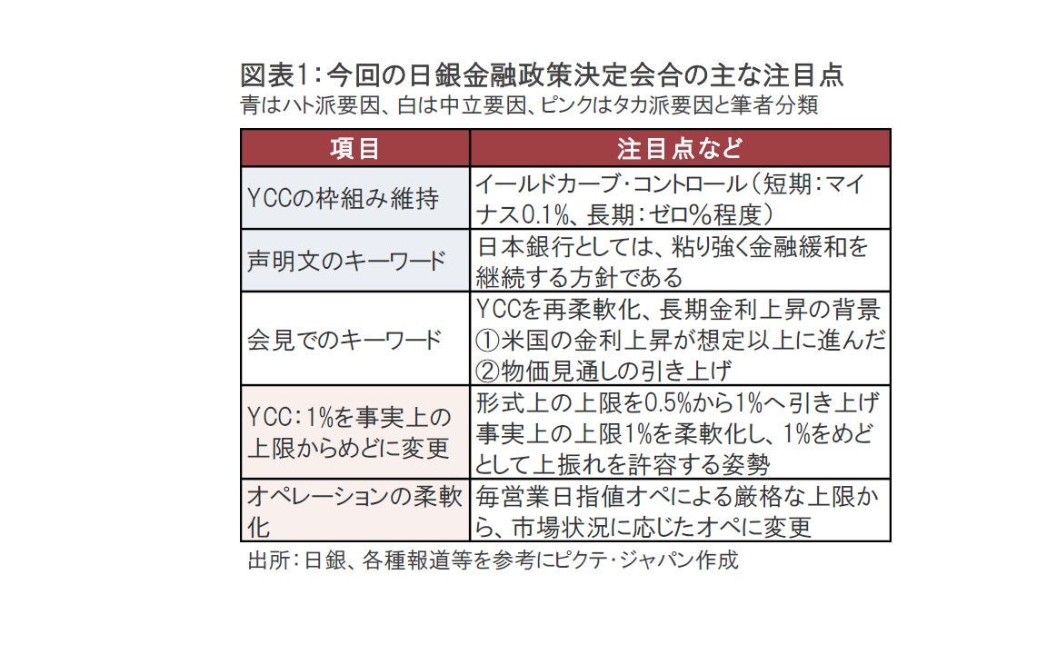図表1は今回の会合の主な注目点をハト派(金融緩和を選好)、タカ派(金融引き締めを選好)、中立で色分けして示しました。なお、市場では1%の上限を1.5%に拡大するという事前の憶測もありました。その立場からすると今回のYCCの再修正はハト派的と見られますが、これは市場の憶測なので図表には含めていません。