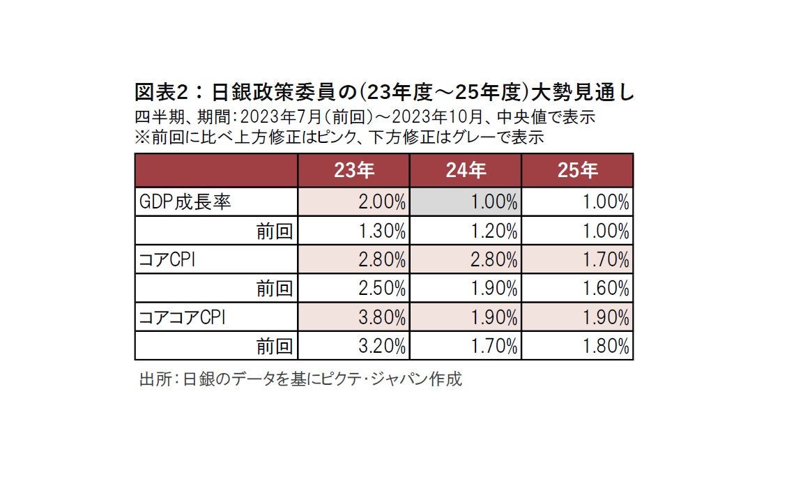 日銀は7月の会合から、わずか3ヵ月程度で日本の長期金利が上昇したことでYCCの再修正を迫られました。その背景として、①米国の長期金利の想定以上の上昇を主要な理由としつつ、②日本の物価見通しの引き上げも影響を与えたように思日銀は7月の会合から、わずか3ヵ月程度で日本の長期金利が上昇したことでYCCの再修正を迫られました。その背景として、①米国の長期金利の想定以上の上昇を主要な理由としつつ、②日本の物価見通しの引き上げも影響を与えたように思われます(図表2参照)。問題は日銀がYCCのさらなる修正、もしくは撤廃やマイナス金利脱却など金融政策を修正するにあたって、何が決め手なのかわかりにくいことです。植田総裁は今回のYCC再修正の理由に①をあげていましたが、米国長期金利は5%をピークとする可能性もあります。その場合、今後の日銀の金融政策は現状維持が長期化することも想定されます。
