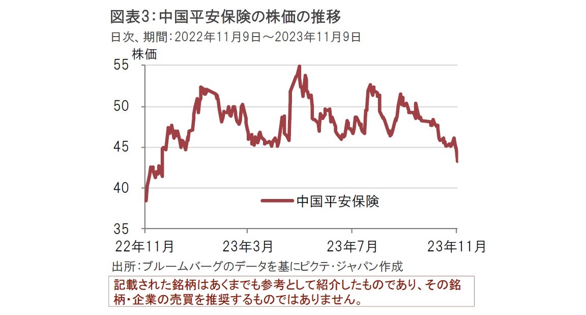 中国の不動産問題がどこまで深刻で、当局がどのように解決しようとしているのか現段階では分かりませんが、最近気になったのは、中国平安保険が資金繰りに苦しむ不動産開発会社碧桂園を買収するよう中国当局から要請を受けたとの報道です(8日にロイターが報道)。報道を受け株価は下落しています(図表3参照)。もっとも、平安保険は報道を否定しています。また平安保険は碧桂園の持ち株を全て売却済みとも報道されており、今後の展開を確認する必要があります。