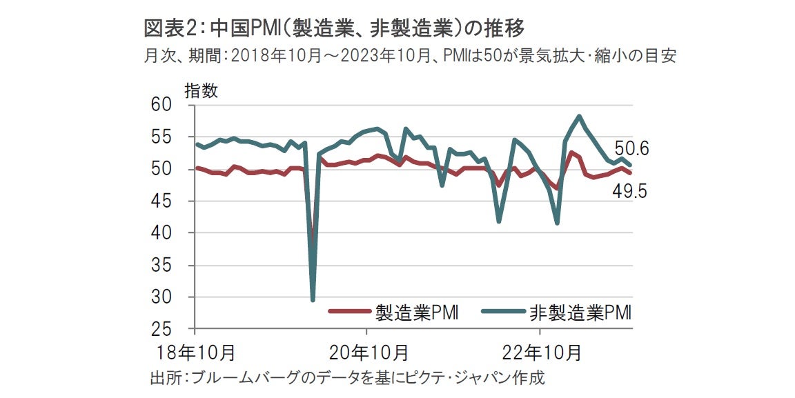 ただし、10月のCPIでサービス価格や食料品価格が伸び悩んだことから、中国の景気回復の持続性には疑問が残ります。また、物価以外でも10月の製造業と非製造業の購買担当者景気指数(PMI)も前月を下回り軟調でした(図表2参照)。製造業PMIは49.5と50を下回り、非製造業PMIも50.6と前月の51.7を下回っているからです。
