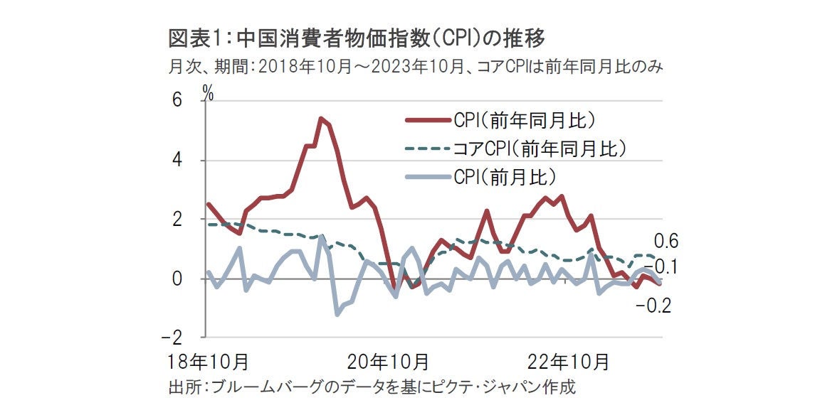 中国国家統計局が2023年11月9日に発表した10月の消費者物価指数(CPI)は前年同月比マイナス0.2%と低下し、7月以来となるマイナスに転じました(図表1参照)。前月比もマイナス0.1%と6月以来のマイナスとなりました。