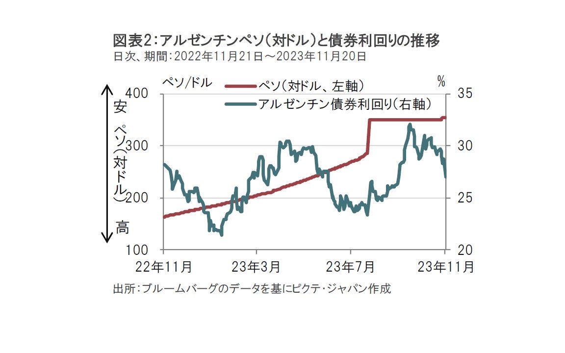 アルゼンチンの大統領選挙が注目されたのは、ミレイ氏が中央銀行を閉鎖しアルゼンチン・ペソをドルで置き換える(ドル化)など極端な主張を繰り返してきたからです。ペソ(公式通貨)の推移をみると、ペソは8月に18%切り下げられるなど通貨防衛に迫られています(図表2参照)。なお、図表2はあくまで公式レートであって、実勢を反映する非公式レートは公式レートを大幅に下回っています。