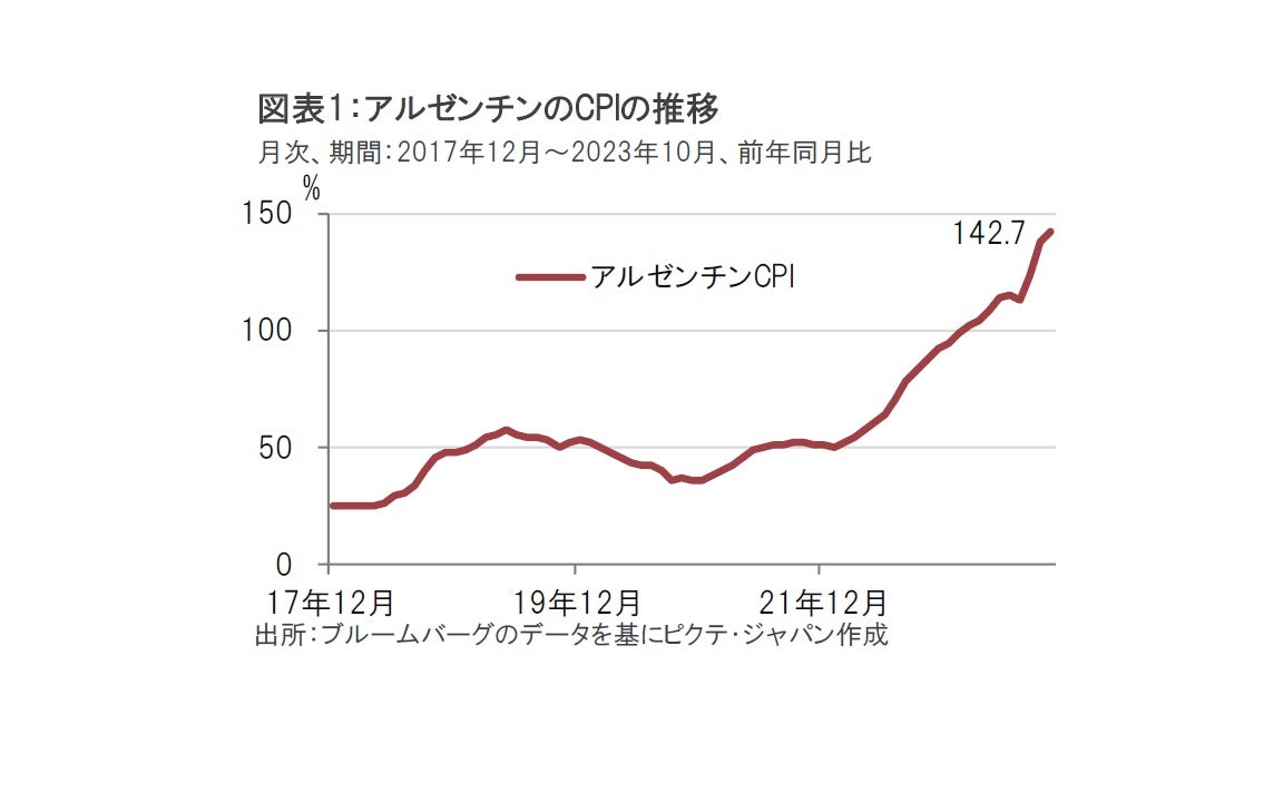 南米アルゼンチンで2023年11月19日、大統領選の決選投票が、野党で右派のハビエル・ミレイ下院議員と、与党連合のセルヒオ・マサ経済相の間で行われました。選管当局(開票率約99%)によると、ミレイ氏の得票率は55.69%、マサ氏は44.30%でミレイ氏が勝利しました。年率140%を上回るアルゼンチンの消費者物価指数(CPI)に対して不満が高まる中(図表1参照)、経済のドル化や中央銀行の廃止といった過激な主張を訴えてきたミレイ氏に支持が集まる結果となりました。