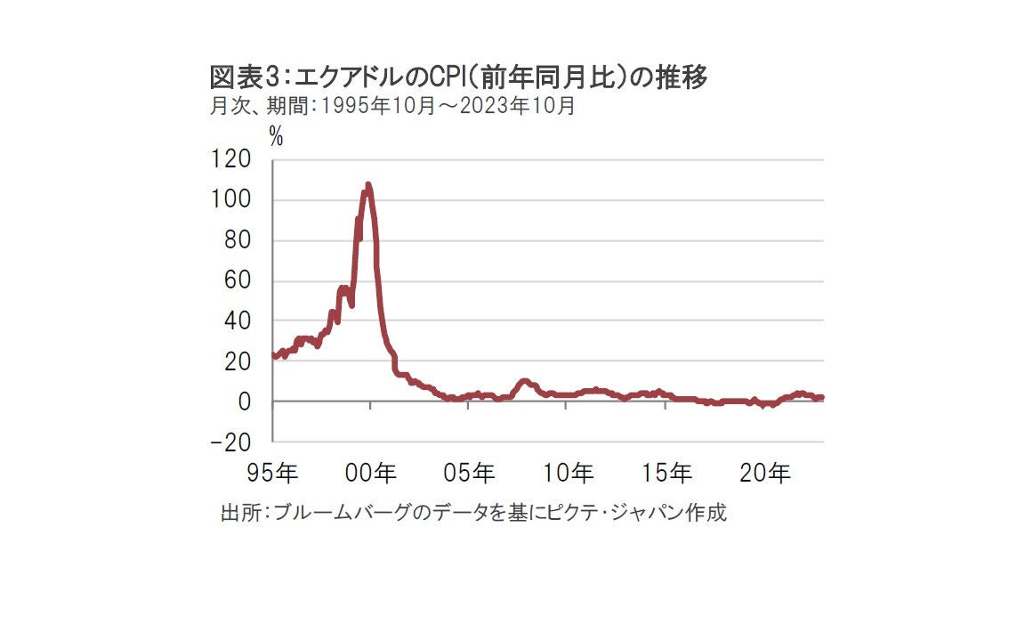 エクアドルにおけるドル化の結果をインフレ率からみると比較的機能しているように見えます(図表3参照)。通貨をドルとしたことで輸入インフレの懸念が後退し、物価が安定したとみられます。しかし、ドル化の運営、維持は試行錯誤の連続でもあり、潜在的なリスクもある点に注意が必要です。