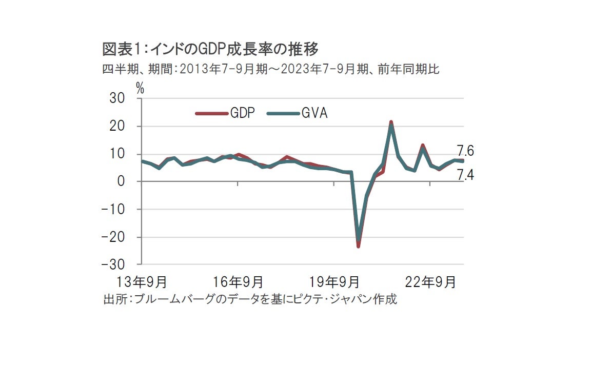 インド政府が2023年11月30日に発表した7-9月期の実質GDP(国内総生産)の成長率は前年同期比で7.6%増と、市場予想の6.8%増を上回りましたが、堅調であった前期の7.8%増は下回りました(図表1参照)。各産業の付加価値を積み上げた粗付加価値(GVA)成長率は7.4%増でした。