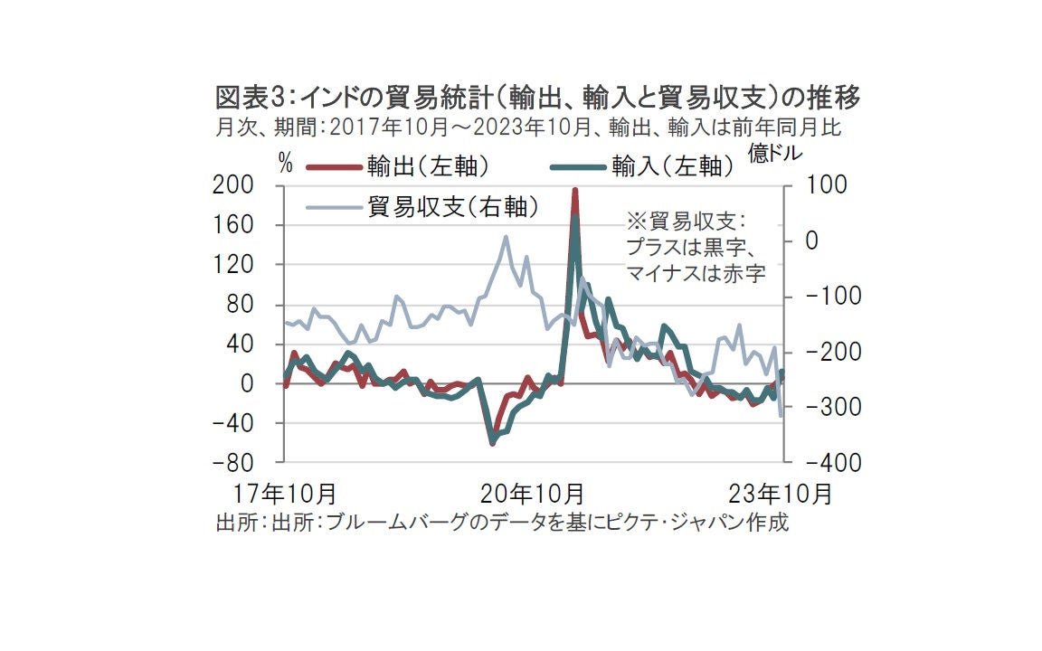インドの外需を貿易統計から振り返ります。インドの10月の輸出は前年比6.2%増と、前月のマイナス2.6%からプラスに転じました(図表3参照)。輸入も12.3%増と、前月のマイナス15.0%から急回復しました。結果として10月の貿易収支は314.6億ドルと大幅な赤字となりました。