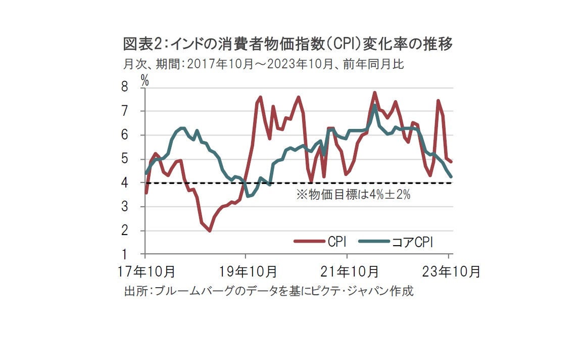 インドのインフレ率は物価目標上限(6%)を下回っている