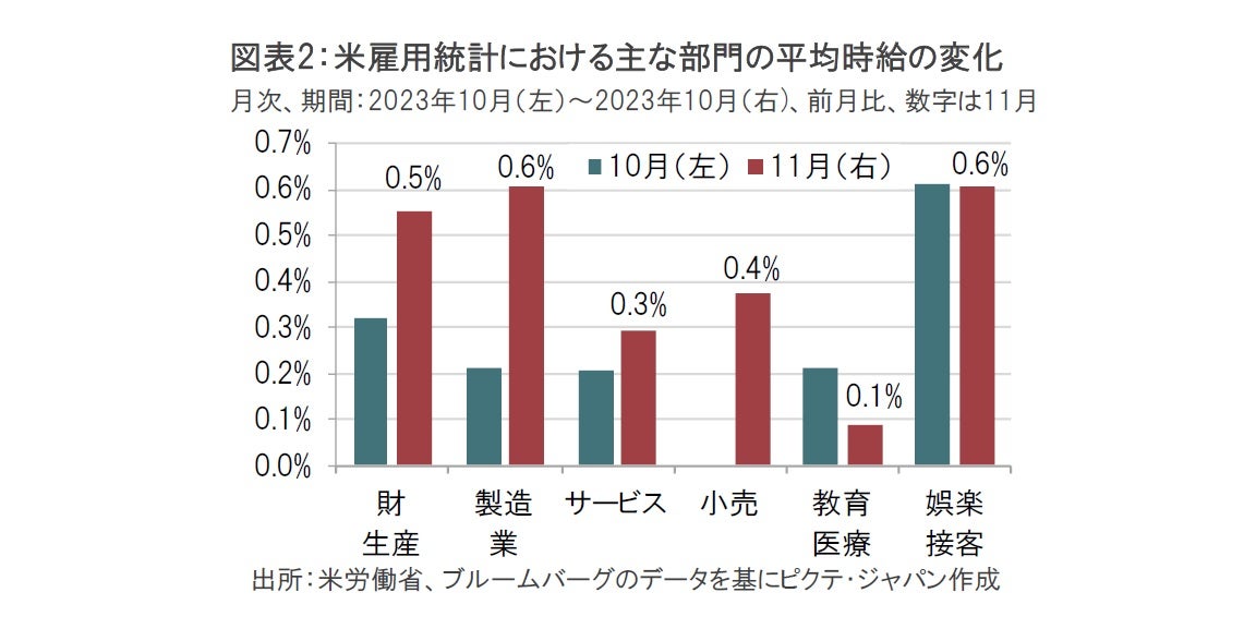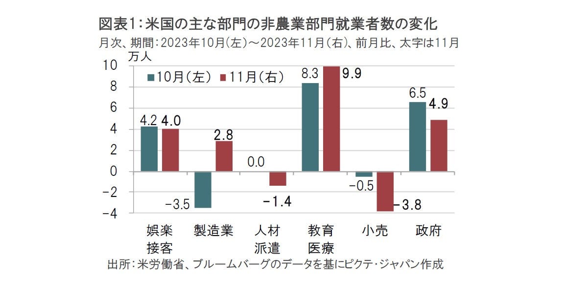 米労働省が2023年12月8日発表した11月の米雇用統計によると、非農業部門の就業者数は前月から19.9万人増と、市場予想の18.5万人増、前月の15万人増を上回った(図表1参照)。11月の就業者数の増加を支えた主なセクターは、増加の勢いは落ちたものの娯楽・接客部門、引き続き堅調な教育・医療と政府部門などです。失業率は3.7%と、市場予想の3.9%、前月の3.9%を下回り、労働市場の底堅さが示されました。