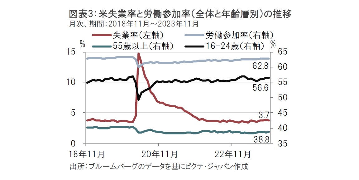 それでも失業率の低下など、11月の米雇用統計は家計調査に基づくデータに米労働市場の底堅さが示されました。11月の失業率は労働市場への労働力の回帰を示唆する労働参加率の上昇を伴い3.7%に低下しました(図表3参照)。また、労働参加率を年齢層別にみると、25-54歳の労働参加率は11月が83.3%と既に高水準であることから前月から横ばいでしたが、労働市場への参入が遅れていた55歳以上のシニア層と、16-24歳の若年層の11月の労働参加率はそれぞれ前月を上回り、幅広い年齢層に労働力の回復が見られました。もっとも、労働参加率の上昇により労働力が確保されれば、中期的に賃金押し下げ要因となる可能性もあります。賃金は、時間との関連性を考慮して総合的な判断が求められそうです。