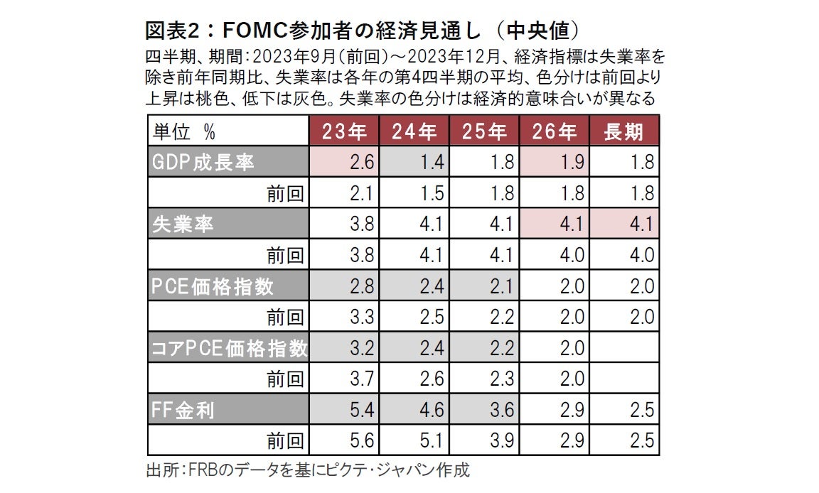 まず、ドットチャートから想定される24年の利下げ回数(1回を0.25%と仮定)が、9月のFOMCにおける2回(0.5%)から3回に増えたことです。23年末の政策金利の水準は5.25%と5.50%の間をとって5.375%として図表1に示されています。24年はFOMC参加者19名の予想の中央値が4.625%に位置しており、この差が24年の利下げ幅で0.75%となり、利下げ回数としては3回分となります。