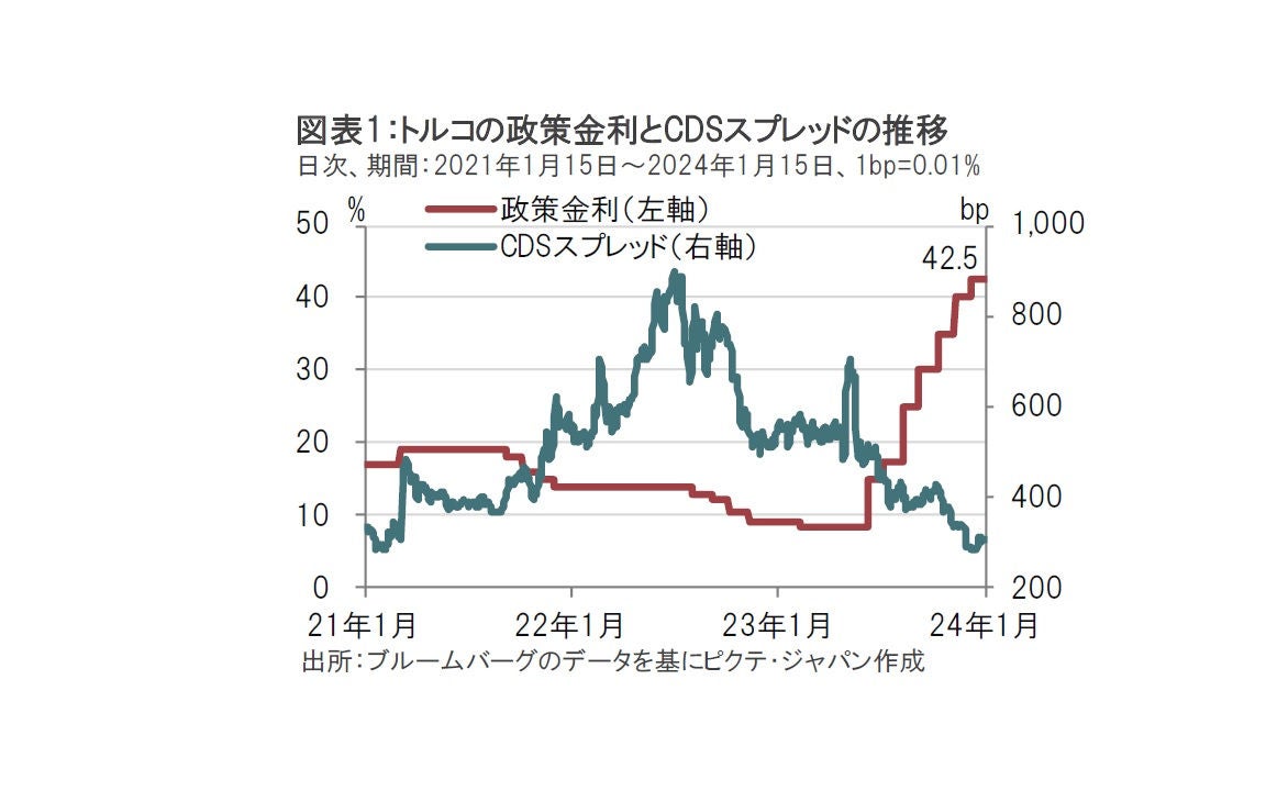 ムーディーズは声明で、トルコの見通しを引き上げた理由として、23年5月のエルドアン大統領再選以後、経済政策運営、とりわけ金融政策が正常化に向かっている点を指摘しています。信用リスクを取引するクレジット・デフォルト・スワップ(CDS)市場でも、23年5月以降CDSスプレッドは低下基調で、トルコの信用力は回復傾向です(図表1参照)。