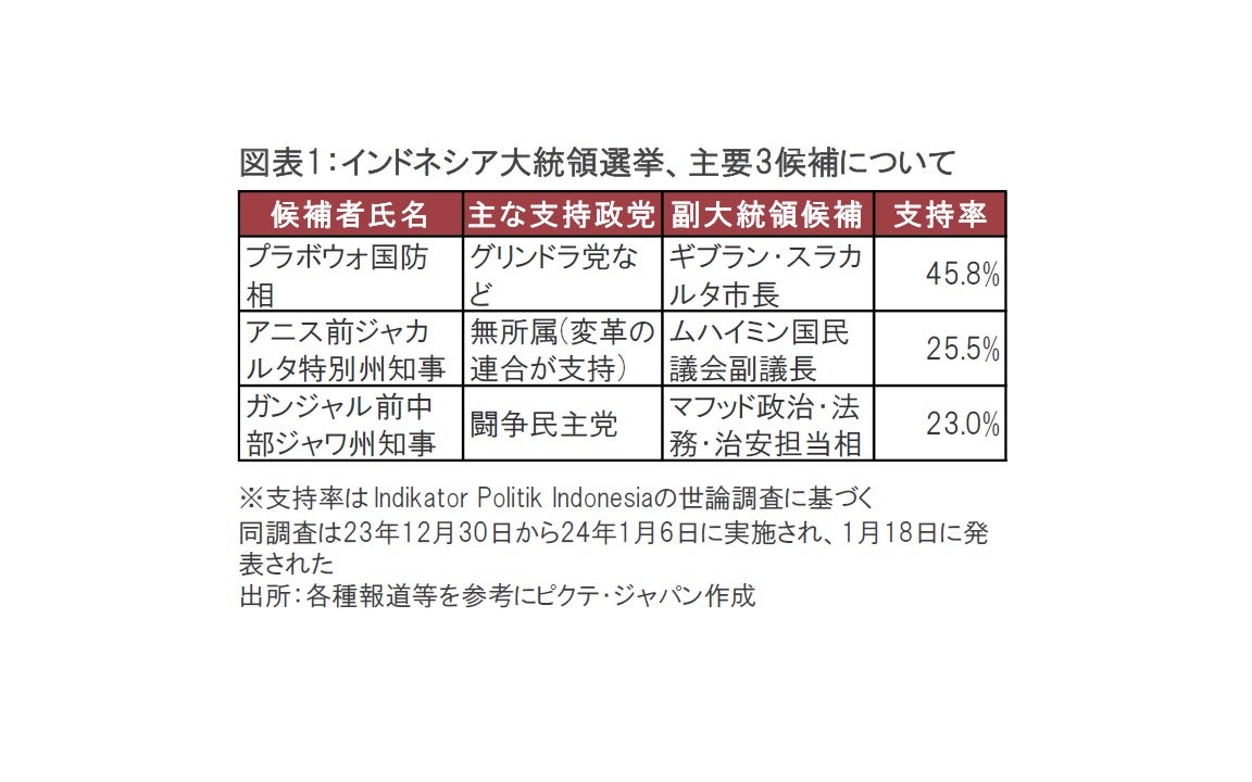 インドネシアでは24年2月14日に大統領選挙の第1回投票と、国民議会選挙の実施が予定されています。大統領選挙の主要3候補は、プラボウォ国防相、アニス前ジャカルタ特別州知事、ガンジャル前中部ジャワ州知事です(図表1参照)。世論調査では23年10月の選挙戦届け出締め切りから足元まで、プラボウォ国防相がリードしています。一方で、アニス候補とガンジャル候補が接戦で2位と3位を争う展開です。なお、最近の世論調査でも約76%と高い支持率を維持する現職のジョコ・ウィドド大統領は憲法の規定(3選禁止)で今年の大統領選挙に出馬できません。