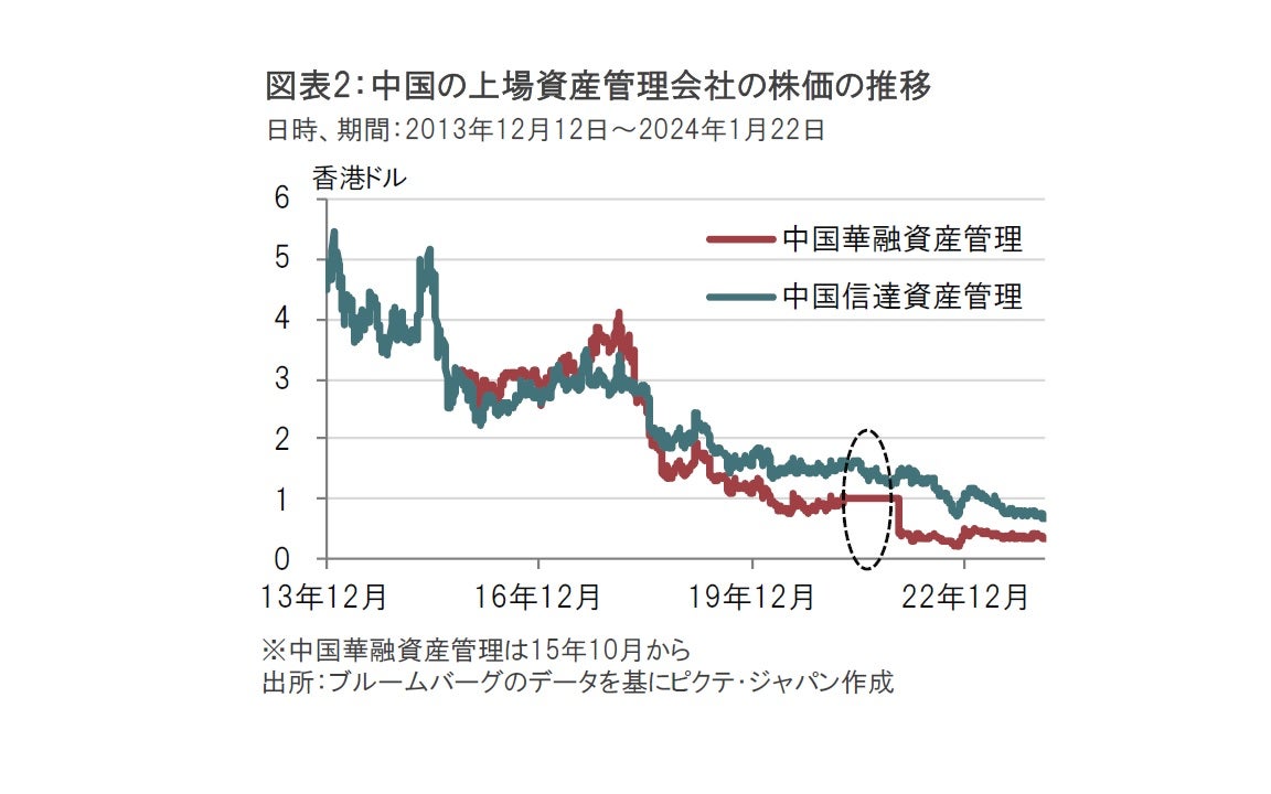 中国当局は資産管理会社の期限を10年と設定していましたが、各社は不良債権処理という骨格を残しつつビジネスモデルを変えることで事業を継続し事業内容の拡大を図ってきました。そうした中、中国華融資産管理と、中国信達資産管理は香港市場に上場しています(図表2参照)。