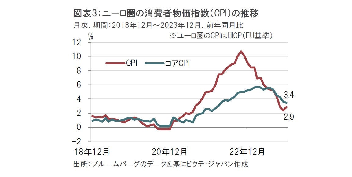 ラガルド総裁のコメントを述べる前に、ユーロ圏の経済動向を簡単に振り返ると、GDP(域内総生産)成長率は22年末から前期比で0%前後を推移しており、形式的な景気後退をかろうじて回避している状況です。ユーロ圏のインフレは減速傾向ですが、変動の大きい項目を除いたコアのインフレ率は12月が前年同月比3.4%上昇と高水準です(図表3参照)。ユーロ圏の労働市場が堅調なことから、サービス部門の価格動向を左右する賃金が、高止まりしているためです。