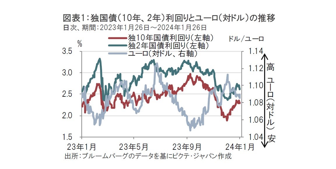 今回のECB政策理事会の発表内容では、声明文の一部修正内容がハト派(金融緩和を選好)寄りと見られたこと、理事会後の記者会見でECBのラガルド総裁が市場の(前のめり?)利下げ開始時期の予想を強く否定しないなど、タカ派(金融引き締めを選好)姿勢を後退させた模様です。25日の市場では、利下げ期待を反映しユーロ安が進行しました(図表1参照)。また、政策金利の動向を反映しやすい2年国債利回りが低下しました。