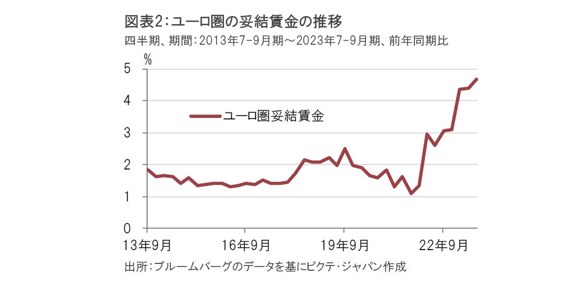 また、ラガルド総裁のコメントはユーロ圏の賃金が上昇懸念だけでなく(図表2参照)、落ち着きの可能性を示唆した印象もありました。