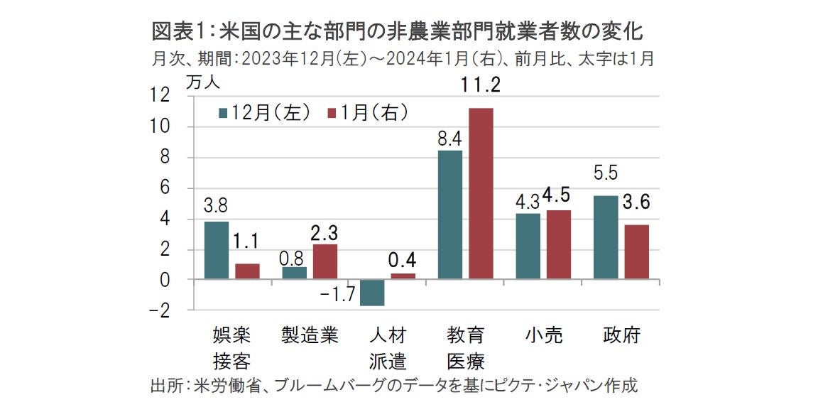 米労働省が24年2月2日に発表した1月の米雇用統計で非農業部門の就業者数は前月比35.3万人増と、市場予想の18.5万人増、前月の33.3万人増(速報値の21.6万人増から上方修正)を上回りました。部門別では、教育や医療、政府部門など景気動向に影響されない分野の伸びが堅調で全体の伸びを押し上げました(図表1参照)。