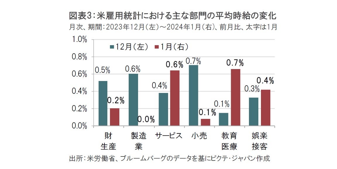 1月の米雇用統計では、インフレに直接的に波及する賃金の伸びも市場予想を大幅に上回り、平均時給は前月比で0.6%増となりました(図表2参照)。部門別の内訳を見ると、製造業等を含む財生産部門は前月比0.2%増と緩やかな伸びにとどまった一方で、雇用の伸びが大きかった教育・医療部門などにけん引されてサービス部門は0.6%増と前月の0.4%増を上回りました(図表3参照)。