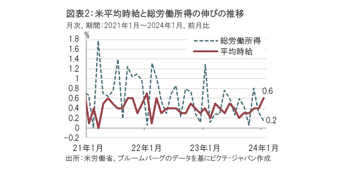 24年1月の米雇用統計の注目点として、非農業部門の就業者数と賃金の伸びが市場予想を大幅に上回ったことが目を引きます。これで市場の一部が織り込んでいた3月利下げ開始の可能性は大幅に低下したと見られます。しかしながら、特に賃金の伸びの強い数字の背後には、内容を確認すべき点も見られます。筆者は年半ばの利下げ開始シナリオを変更する必要はないと見ています。