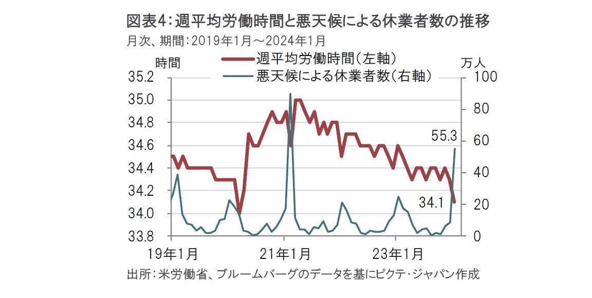 さらに、1月の平均時給は悪天候の影響を受け上昇した可能性にも注意を払う必要があります。悪天候のために就労しなかった労働者数(休業者数)は1月が55.3万人と、ほぼ3年ぶりの高水準でした(図表4参照)。その影響で、週平均労働時間は34.1時間と、過去の景気後退期に近い低さでした。このため、時給、労働時間、労働者数の積である総労働所得を見ると前月比の伸びは0.2%増にとどまり過熱感は見られません(図表2参照)。