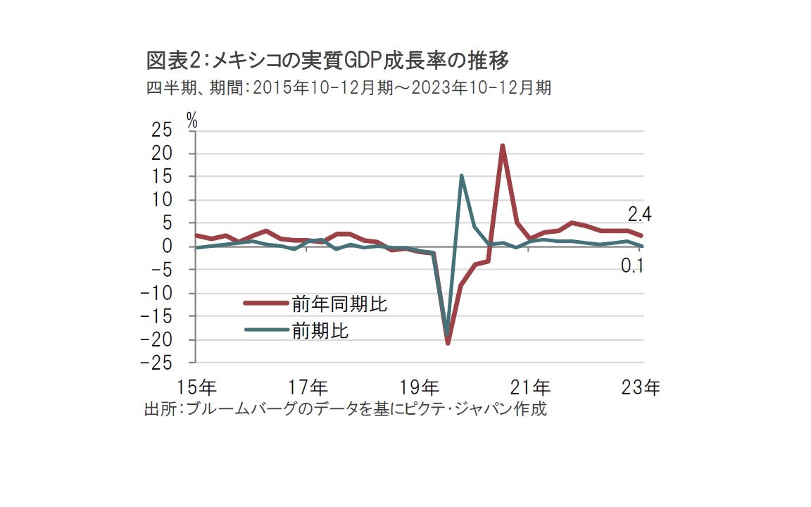 一方で国内需要は高金利とこれまでの高水準のインフレの影響で押し下げられました。メキシコの23年通年のGDP成長率は3.1%増と、メキシコ中銀の予想である3.3%を下回っており、景気のてこ入れの必要性がうかがえます。