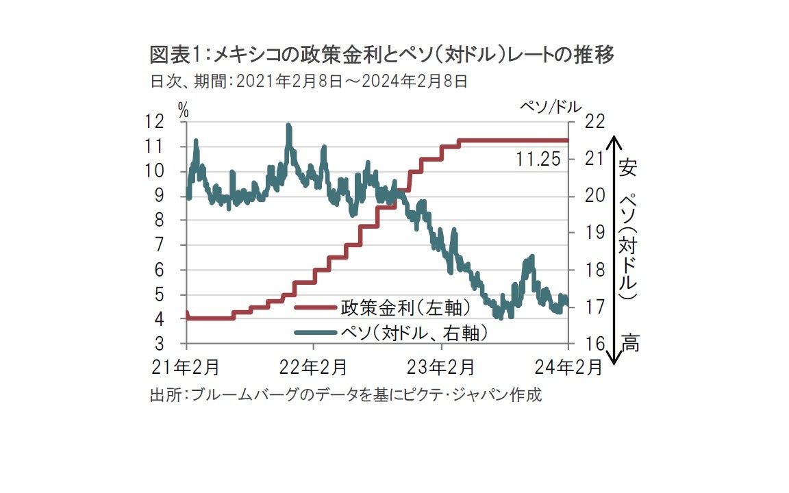 メキシコ銀行(中央銀行)は24年2月8日、市場予想通り政策金利を11.25%に据え置くと発表しました(図表1参照)。据え置きは7会合連続で、全会一致での政策金利の据え置きとなりました。