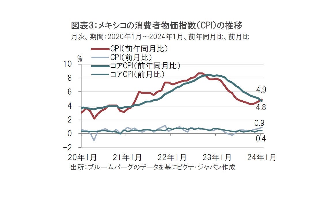 次に、メキシコのインフレ動向を振り返ります。中長期的な動向を、変動の大きい項目を除いたコアの消費者物価指数(CPI)の前年同月比で見ると減速傾向は明確となりつつあり、利下げを開始すべき要因と思われます(図表3参照)。もっともメキシコ中銀の物価目標は3%±1%であることから、メキシコ中銀はもう一段の低下を見守りたいのかもしれません。また、CPI(食料品など変動項目をを含む)は足元再上昇の兆しも見せています。24年1月のCPIは前月比0.9%上昇し、23年12月の0.7%上昇を上回りました。
