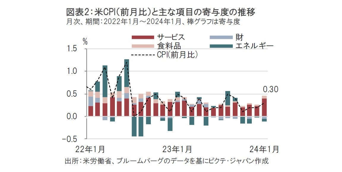 この背景として、インフレ率低下のペースが想定より緩やかとの見方が増えているためと見られます。1月の米CPIの変化率の構成をエネルギー、食料品、財、及びサービスの各項目に分類し、各項目の寄与度などを参照しながら振り返ると、サービス項目がCPIの伸びの大半を占めています。サービス価格は1月に前月比で0.7%上昇し、前月の0.4%上昇を大幅に上回ったことでも影響の大きさが伺えます。