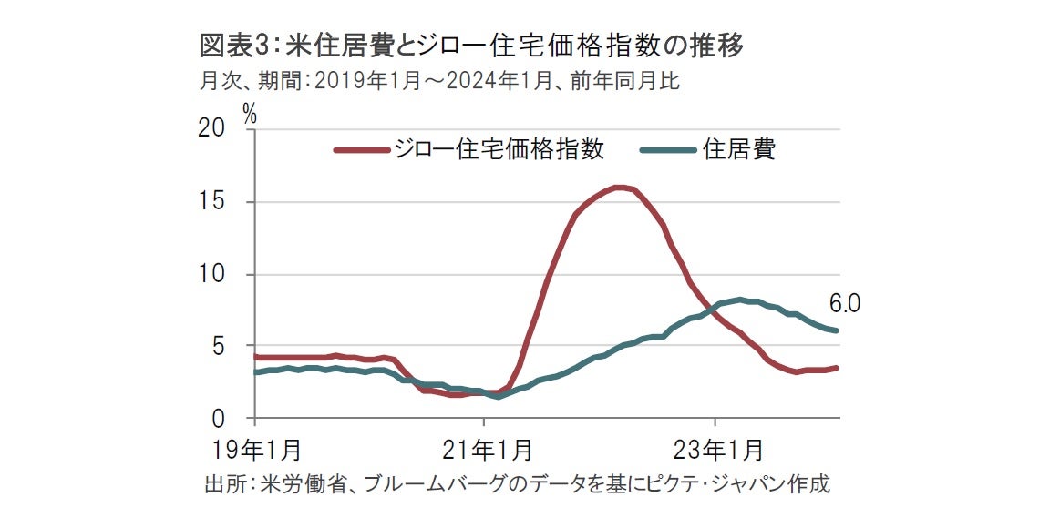 サービス価格は賃料など住宅関連項目で構成される住居費がサービス価格の6割弱を構成します。1月の住居費は前年同月比で6.0%上昇と、依然水準は高く、前月の6.2%上昇からの下げ幅も緩やかです(図表3参照)。住居費の大半を構成する賃料や帰属家賃(持ち家を家賃換算)は住宅市場の動向に遅行する傾向があります。速報性のある住宅価格指数として知られるジロー住宅価格指数が先行して鈍化したことから、住居費もこの先低下が想定されます。米連邦準備制度理事会(FRB)のパウエル議長も過去の講演でジロー住宅価格指数の先行性に言及し、住居費低下の可能性を示唆していました。しかし、足元で米国の住宅市場に回復の兆しがみられる中、住居費が下がり続けるのか見守る必要がありそうです。