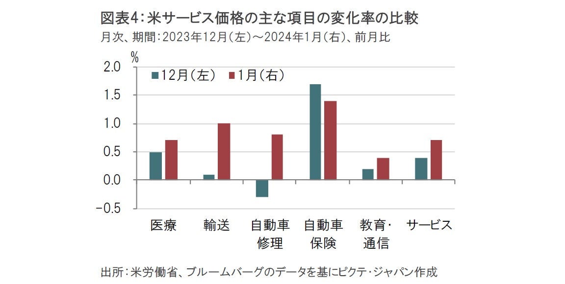 医療や、輸送、教育・通信など多くの項目で、1月の伸びが23年12月を上回りました。構成割合が比較的大きい医療は1月が前月比で0.7%上昇と比較的高い伸びとなっています。これらの項目の価格の多くは賃金動向と連動する傾向があります。2月月初に発表された1月の米雇用統計で賃金(平均時給)が市場予想を大幅に上回ったことと整合的にも見えます。もっとも、賃金を価格へ反映させるには時間的な差異もあることから、しばらく様子を見る必要がありそうです。なお、1月の平均時給の上昇は天候不順による平均労働時間の減少の影響でかさ上げされた面もあると見られ、こちらも様子を見る必要がありそうです。