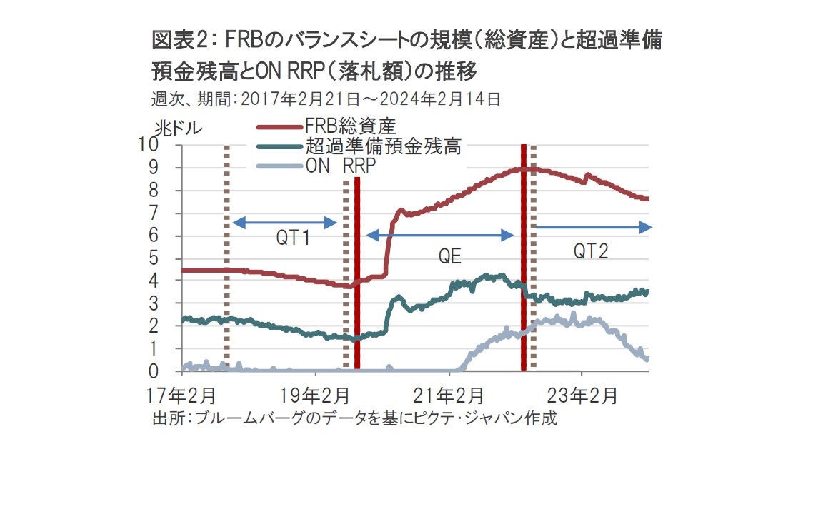 米連邦準備制度理事会(FRB)のパウエル議長は24年1月の米連邦公開市場委員会(FOMC)後の会見で、量的引き締め(QT)について「次回の3月のFOMCでより深い議論を始める計画」と述べ、QTの終了を模索し始めていることを示唆しました。FRBは08年の金融危機後から金融政策のツールとして従来の政策金利に加えて、金融緩和には量的緩和(QE、FRBによる国債等の購入)、金融引き締めにはQTを併用しています(図表1参照)。初期のQEでは直後にQTを実施せず、FRBは保有資産残高を維持しました。最初のQTは17年に始まり、現在のQTは22年に開始されました。