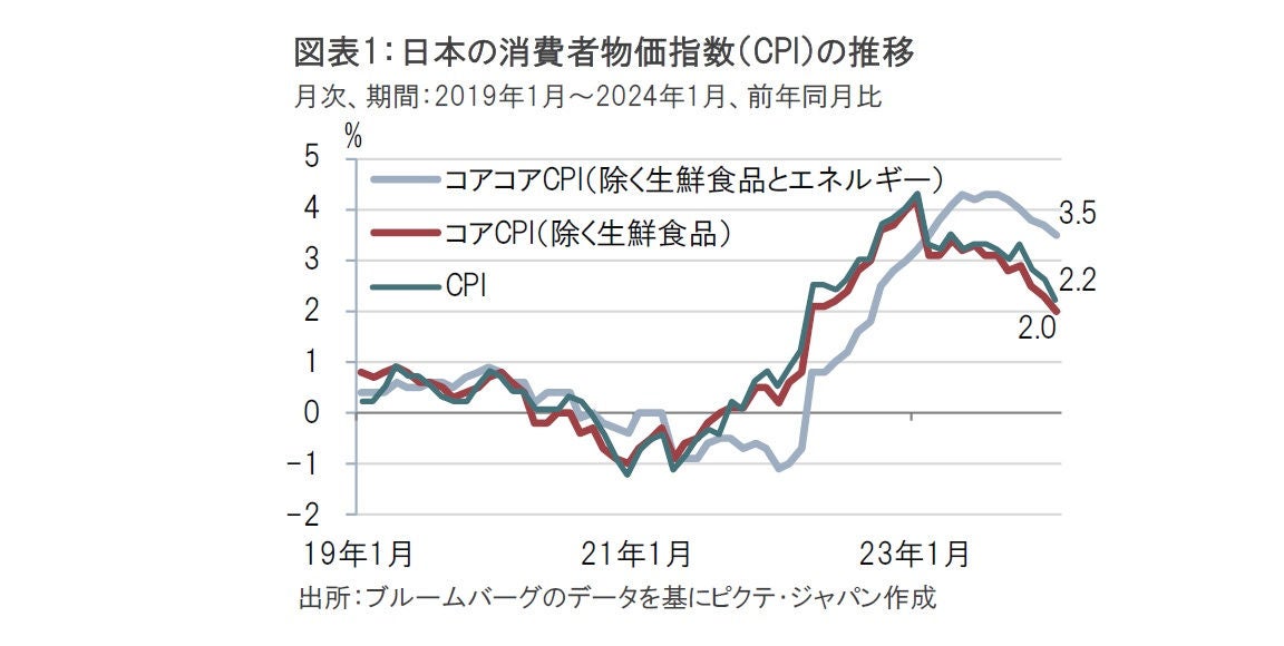 総務省が24年2月27日に発表した1月の消費者物価指数(CPI)は変動の大きい生鮮食品を除いたコアCPIが前年同月比で2.0%上昇と、23年12月の2.3%上昇は下回ったものの、市場予想の1.9%上昇を上回りました(図表1参照)。総合CPIは前年同月比2.2%上昇し、生鮮食品とエネルギーを除いたコアコアCPIは3.5%上昇しました。