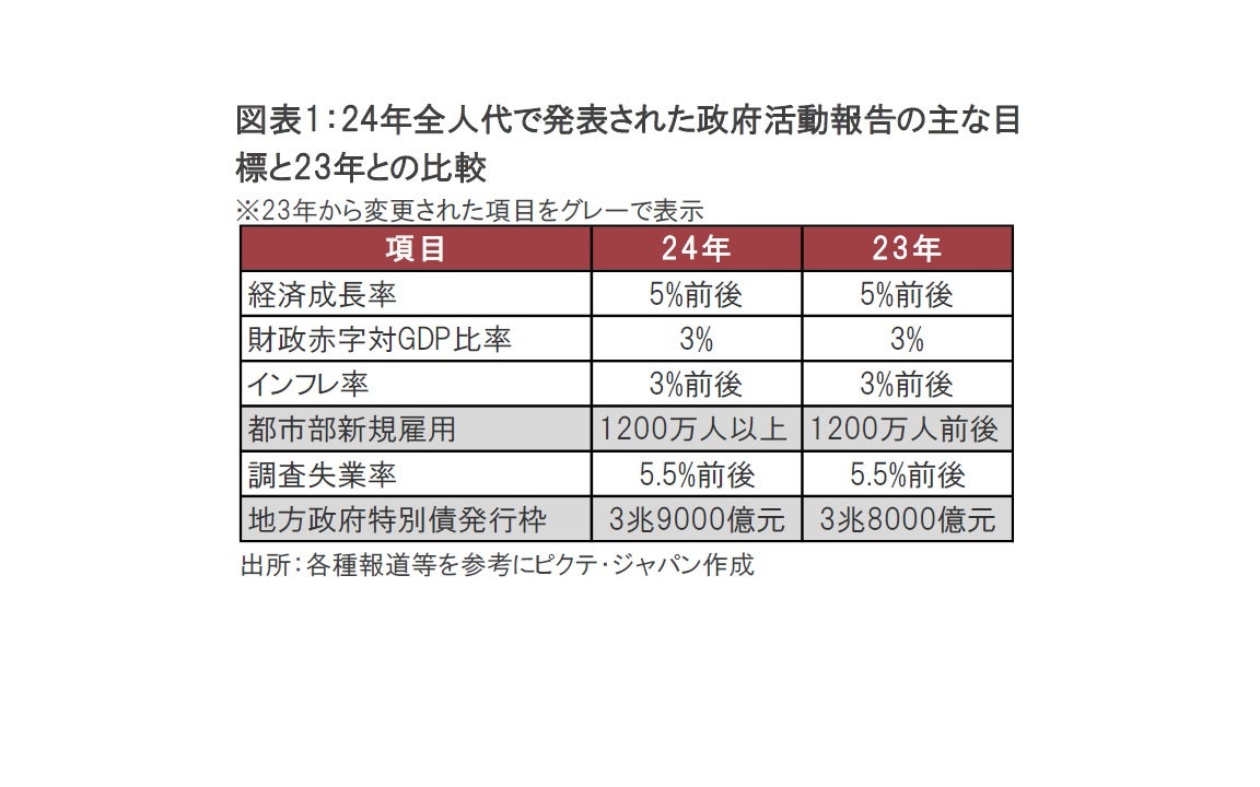 中国の第14期全国人民代表大会(全人代、日本の国会に相当)の第2回会議が24年3月5日に開幕しました(3月11日まで7日間の日程)。例年通り李強(リー・チャン)首相が政府活動報告を行い、その中で24年の実質経済成長率の目標は「5%前後」が示され、23年目標と同水準に据え置かれました(図表1参照)。